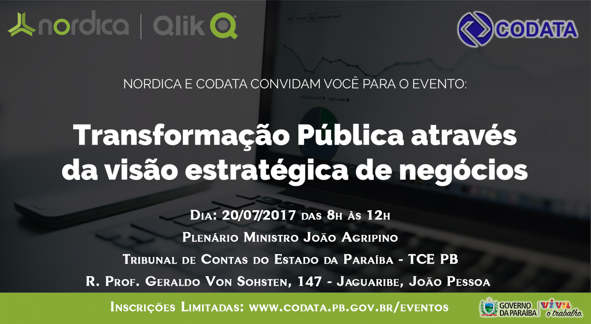 A Companhia de Processamento de Dados da Paraíba – CODATA e a Nordica Software, oferecerão no próximo dia 20/07/17, às 08h, no Plenário Ministro João Agripino - Tribunal de Contas do Estado da Paraíba-TCE PB, situado na Rua Professor Geraldo Von Sohsten, 147, Jaguaribe - João Pessoa - Paraíba, o Evento: Transformação Pública através da visão estratégica de negócios, apresentando o Business Intelligence(BI) e Casos de Transparência Pública.