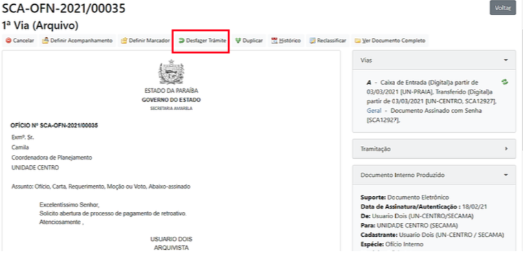 4.2 Desfazer Tramitação de Documento